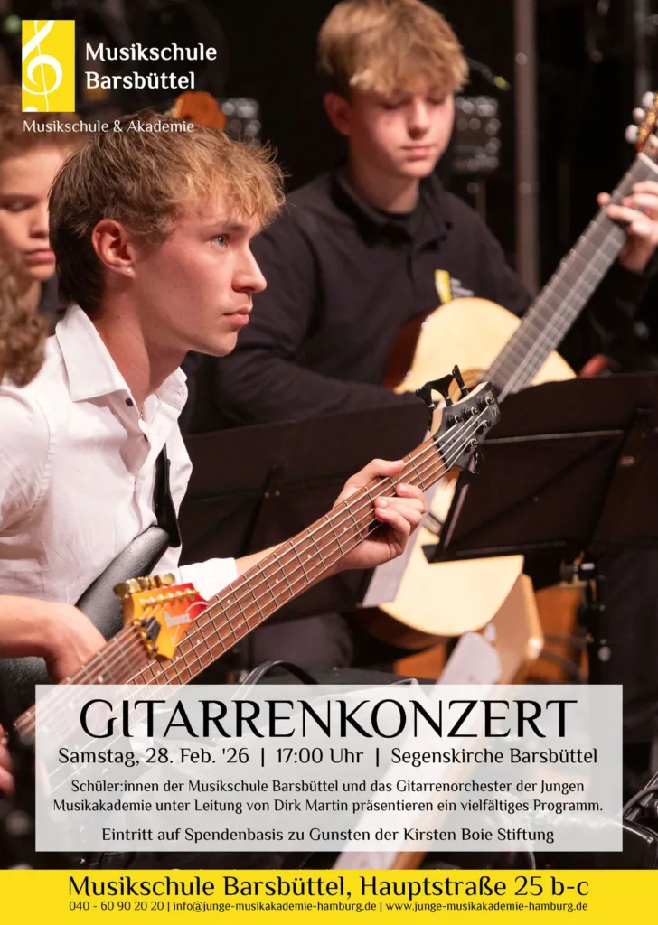 Benefizkonzert mit fortgeschrittenen Gitarrenschüler:innen und dem Gitarrenorchester der JMA zu Gunsten der Kirsten-Boie-Stiftung.