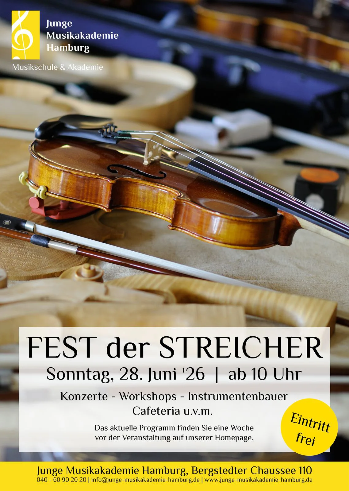 Auf dem Gelände und in den Sälen der Jungen Musikakademie Hamburg. Workshops & Präsentationen rund um die Familie der Streichinstrumente, Instrumentenbauer zeigen ihr Handwerk, Instrumente ausprobieren, Kontrabass für Kinder, Musikalienflohmarkt, Cafeteria u.v.m.Das aktuelle Programm finden Sie eine Woche vor der Veranstaltung auf unserer Homepage. Eintritt frei