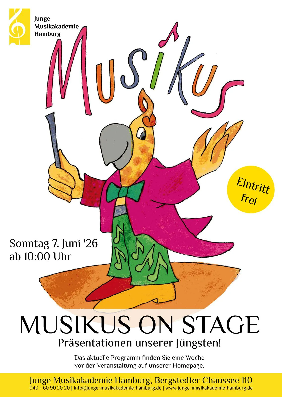 Auf dem Gelände und in den Sälen der Jungen Musikakademie Hamburg. Präsentationen unserer Jüngsten! Abschlussaufführungen der Musikalischen Früherziehung und der Musikalischen Grundausbildung mit Rahmenprogramm. Eintritt frei